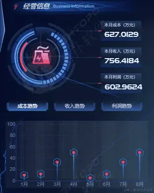 大屏左侧厂区信息面板展示了本项目主要信息,涵盖厂区信息和经营概况。其中经营概况提供查看实时的成本、收入、利润动态趋势图。右侧展现安全生产天数,记录了厂区安全投产累计时间。同时,设备运行效率和生产数据密切监控着锅炉及汽轮发电机组的实时效率和参数。