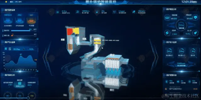 触发智慧生产功能后,系统首先会引导用户进行全厂关键设施设备的轮巡。依据电厂的核心运作工艺顺序,以鸟瞰视角精确定位至关键节点,结合 3D 动画和 2D 实时数据面板进行全面展示。重点关注设备有:卸煤机、输煤皮带、煤场、斗轮机、碎煤机、给煤机、磨煤机、锅炉、汽轮机、发电机等,通过前端对接后端 Http、WebSocket 等协议接口,实现前端页面实时数据的渲染展示。