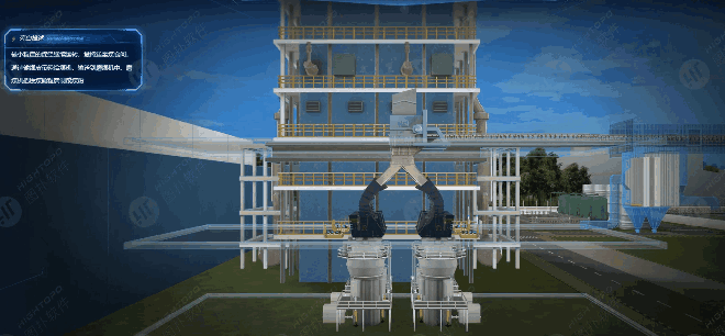 图扑软件构造轻量化的 3D 可视化智慧锅炉监控场景,数字孪生锅炉运作流程,帮助用户清晰直观呈现设备的部件组成及动态运作全流程。