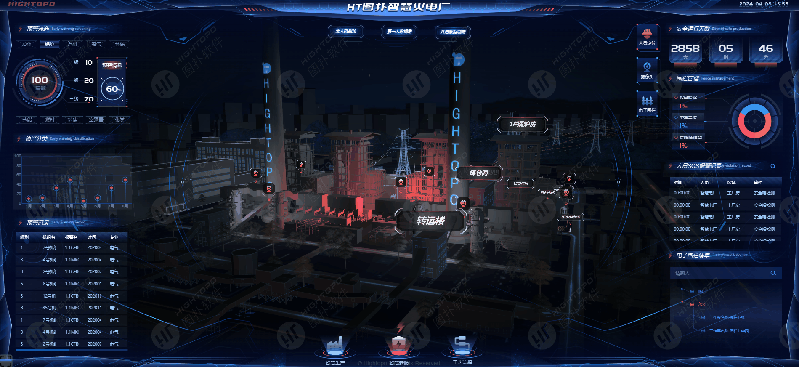 图扑软件 HT 支持多种方式的模型渲染,采用轻量化三维建模技术,高度还原电厂全貌。以三维场景为基础,搭配 2D 数据面板展示,数字化展现火电厂的智慧生产、智慧安防、工艺流程等日常管理模块。