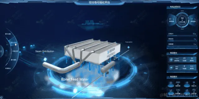 三维监控场景能形象还原该环节工况运作全流程。用户点击关键设备,展开多视角切换查看,方便运维人员通过不同角度,查看各凝气器单元、管束等设备内部的实时工况