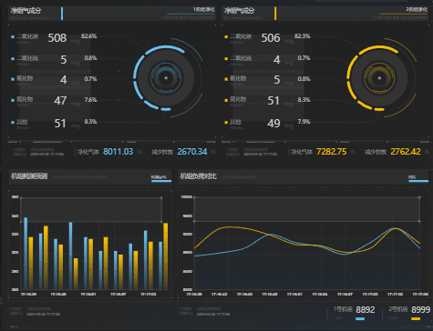 左侧看板集中展示了电厂概况、场区运行情况、生产效率趋势、实时告警信息列表等数据;右侧看板专注展示脱硫塔净烟气数据、锅炉机组煤耗预测数据、机组负荷对比曲线。