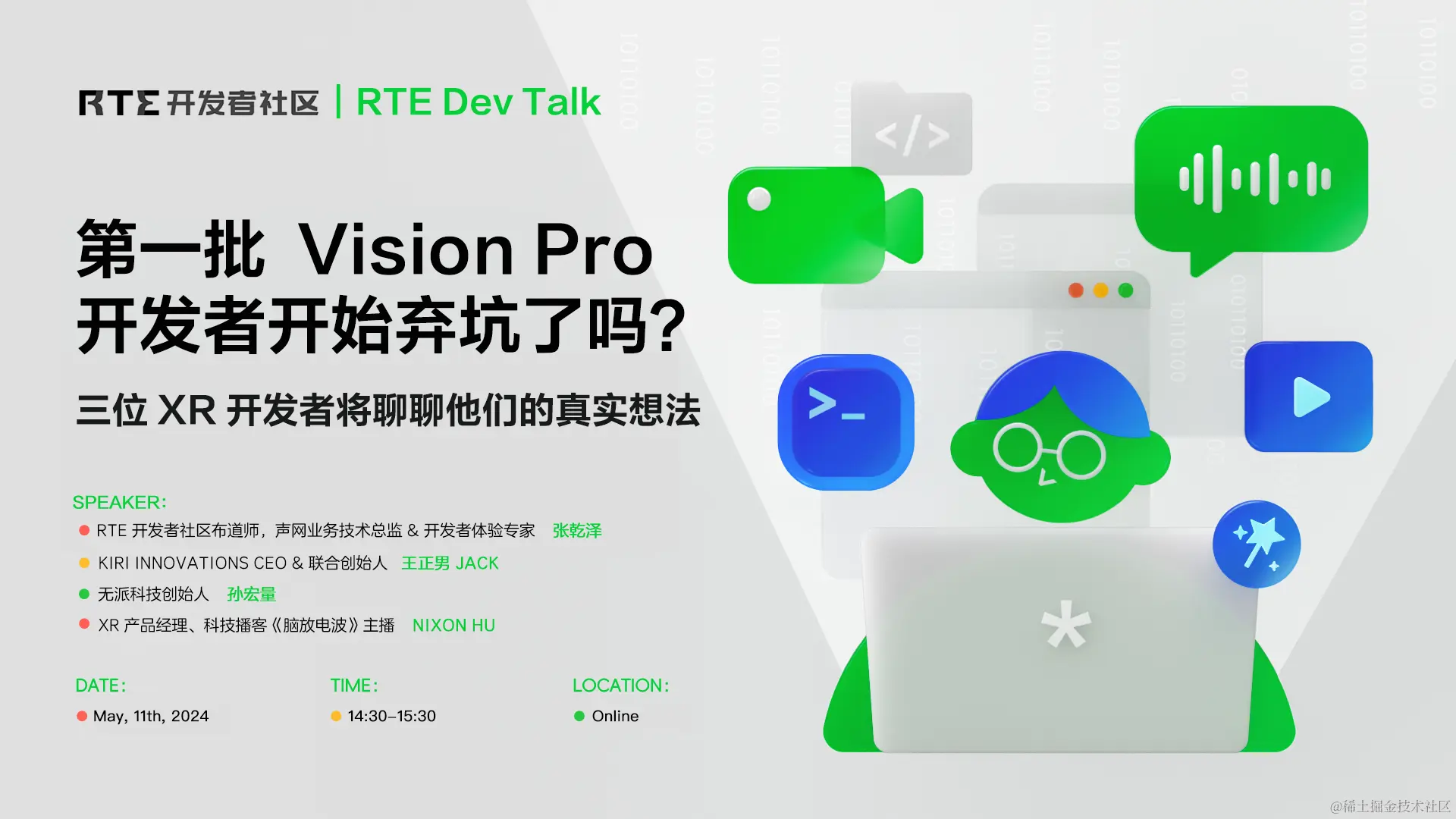 5 月 11 日(周六)14:30,RTE 开发者社区邀请了 3 位业界技术大佬,深入分析 Vision Pro 技术的核心原理,展示其在提升 XR 体验方面的优势,并展望该技术如何推动整个行业向更高层次的交互性和真实感发展。我们还将聚焦于 XR 行业的最新动态,探讨其在不同行业中的实际应用和潜在影响,以及未来的发展趋势。
