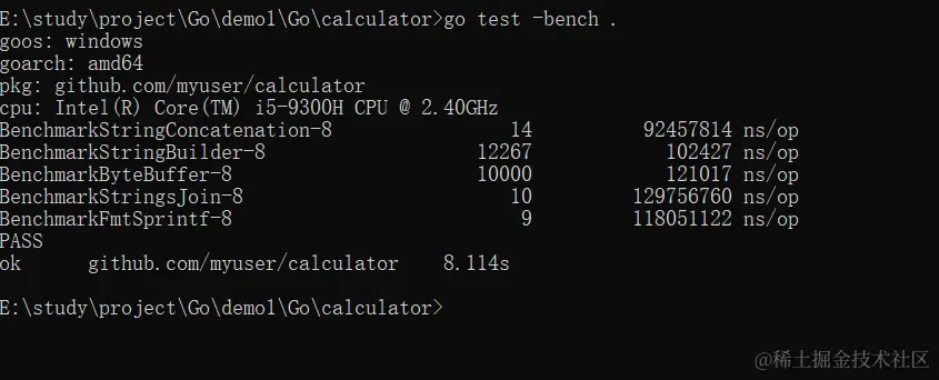 其中,BenchmarkStringConcatenation、BenchmarkStringBuilder 和 BenchmarkByteBuffer、BenchmarkStringsJoin 是测试代码中定义的三个测试函数。
