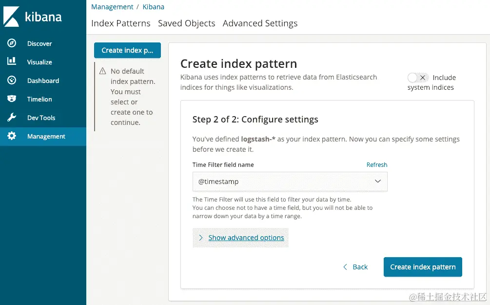 接下来,我们需要指定包含时间戳的字段。这是一个简单的选择。从时间过滤器字段名称中选择@timestamp,并单击“创建索引模式”按钮。
