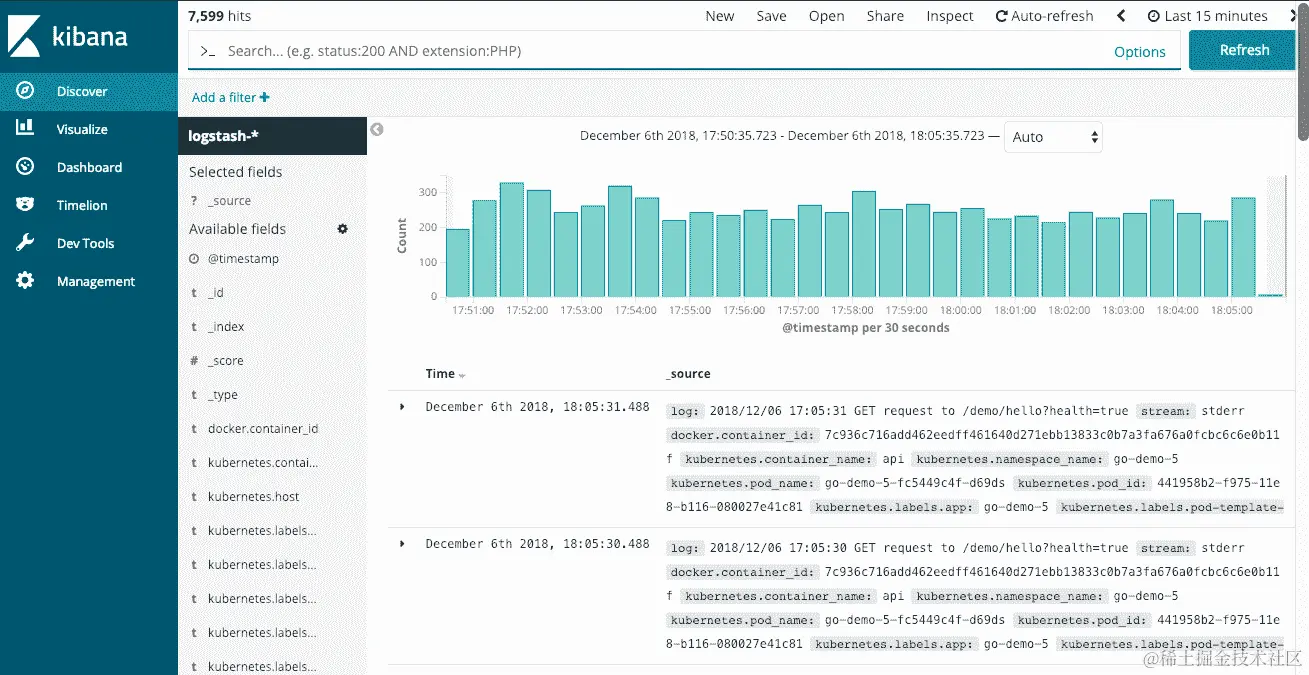 您在面前看到的是过去十五分钟内生成的所有日志(可以延长到任何时期)。字段列表位于左侧。