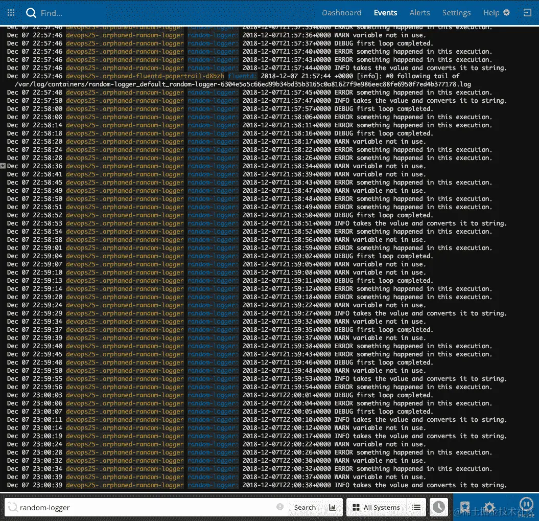 我们的情景与以前相同。我们将尝试找到从random-logger应用程序生成的所有日志条目。