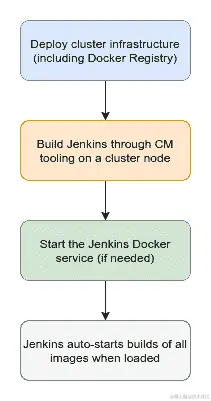 首先进行集群部署,以确保我们有一种构建引导映像的方法,然后使用 Docker Registry 存储构建后的映像。随后,在任何可用的 Docker Engine 节点上构建 Jenkins 映像,并将其推送到注册表,以便服务将具有正确的映像来启动。如果需要,然后使用相同的配置管理工具(如 Ansible)或编排工具启动所述服务,并等待自动启动作业,该作业将构建所有其他剩余的映像,这些映像应填充注册表以运行完整的集群所需的所有其他映像。这里的基本思想是通过 CM 工具进行初始引导,然后让 Jenkins 服务重新构建所有其他映像并(重新)启动任务。