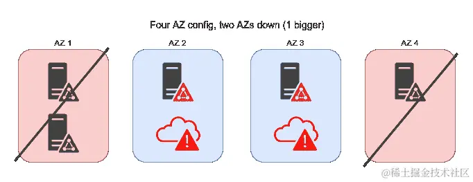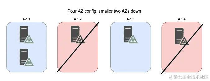 当然,展示偶数对效果的影响也是很好的,因为我们提到它们可能有点麻烦。有了四个可用区域,我们可以做出的最佳分割是在它们之间进行2-1-1-1的分配,根据这些数字,我们只能容忍两个区域不可用,如果它们都只包含一个节点。通过这种设置,我们有一半的几率,即两个不可用的区域将包括其中有两个节点的区域,使得不可用的总节点数超过 3 个,因此集群将完全离线: