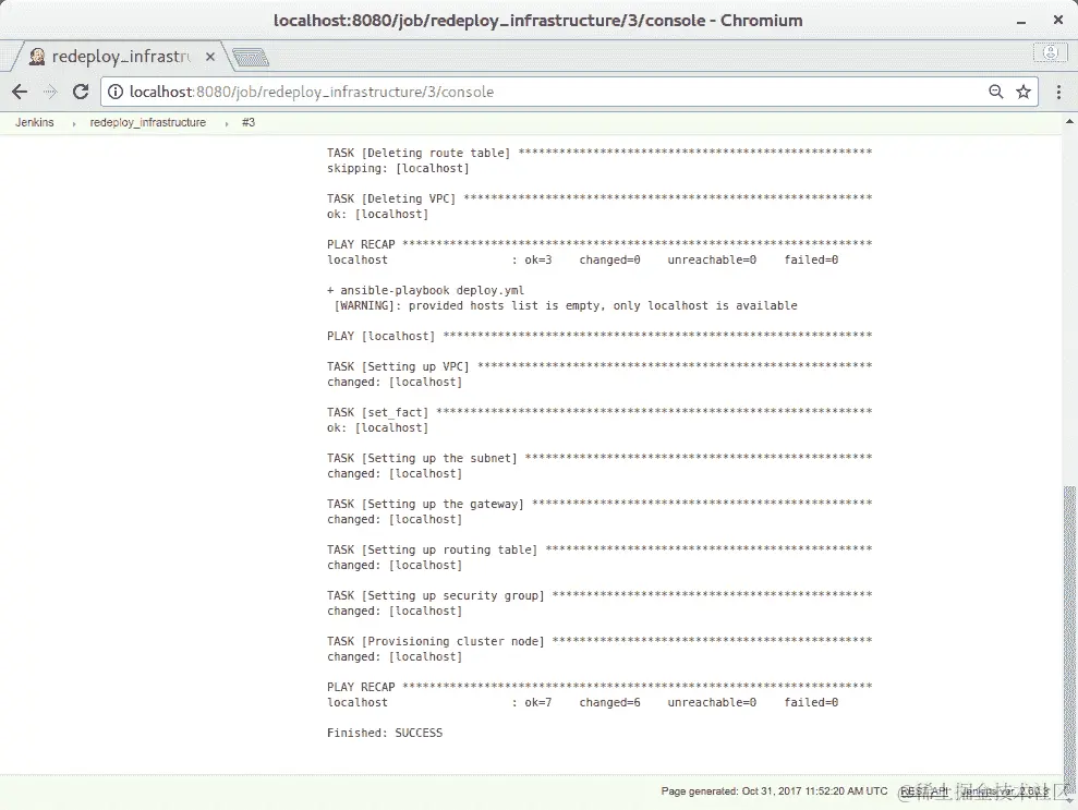 成功!正如您所看到的,通过 Jenkins 和一些小的配置,我们刚刚实现了我们简单基础设施的自动部署。虽然粗糙但有效,通常情况下,您不希望重新部署所有内容,而只是更改了的部分,并且 Jenkins 生活在集群中,但这些都是一些更复杂的努力,将留给读者作为可能的改进点。