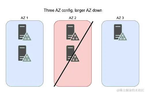 现在让我们看看在三个可用区域中我们可以获得什么样的弹性。使用五个管理节点的最佳布局将是2-2-1,如果你仔细观察任何一个区域失效时会发生什么,你会发现始终保持了法定人数,因为我们将从集群的其余部分获得*3 (2+1)或4 (2+2)*个节点,确保我们的服务运行正常: