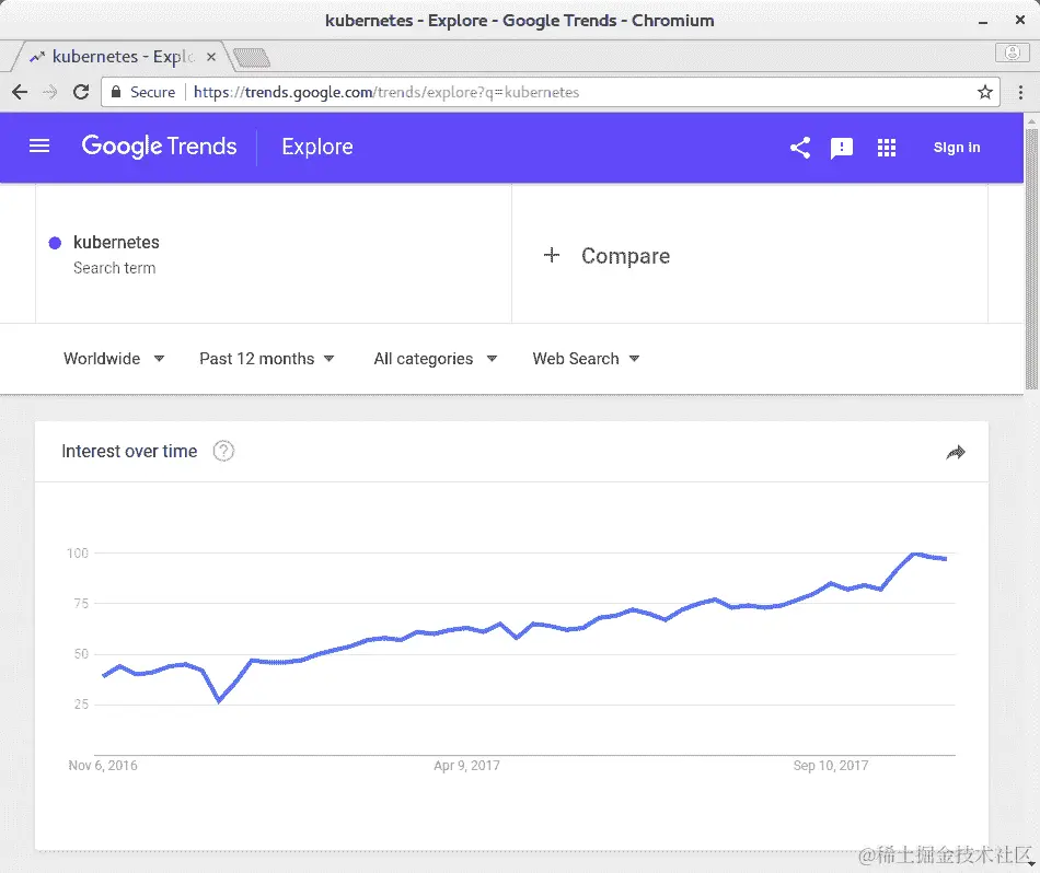 在上面的截图中,你可以看到 Kubernetes 的兴趣随时间的增加而明显增加,这在某种程度上反映了社区对该编排工具的采纳和接受。如果我们要自己实施这项技术,我们可以相当肯定,在一段时间内,我们将使用一种更容易使用并获得支持的工具。