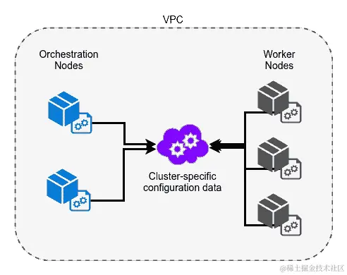 通过拥有这种强大的自动加入功能,您可以消除与扩展集群的手动工作大部分相关的工作,因为除了启动它之外,无需与 VM 实例进行交互。这种架构的一个相当简单的示例如下图所示,其中编排和工作节点有各自的映像,并在启动时使用 VPC 内的共享配置数据提供程序进行自我配置: