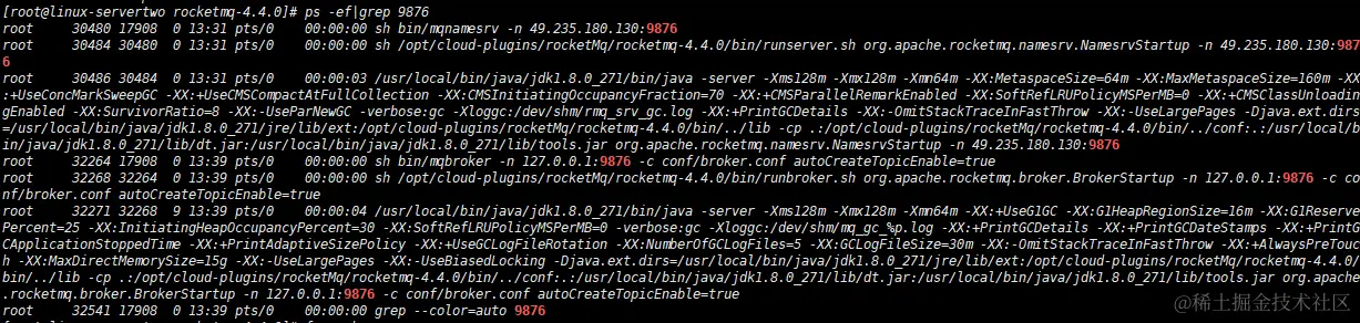 指定NameServer的地址和启动端口(8830)以及输出日志。由于内部不够,设置JVM参数启动,如果使用的linux系统内存足够可以忽略jvm参数。启动命令如下: