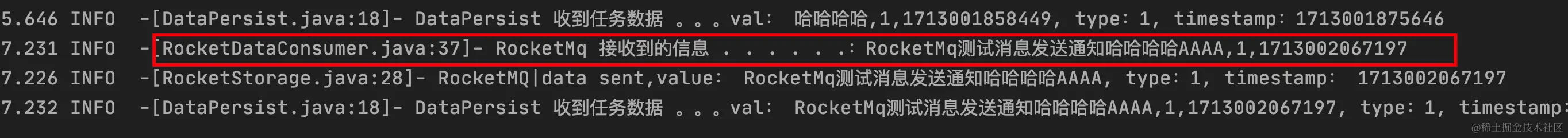 log.info("RocketMQ|data sent,value: {}, type:{}, timestamp: {}", value, type, timestamp);