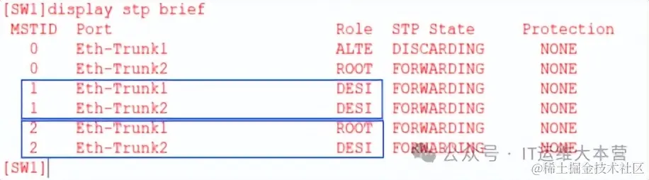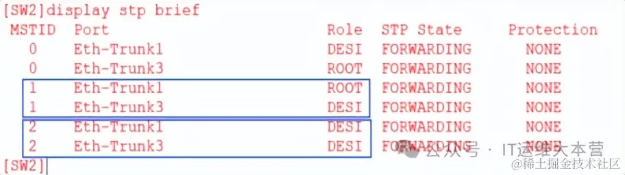 此时SW1为实例1的主根桥,SW2为实例2的主根桥,从而实现了vlan间的负载