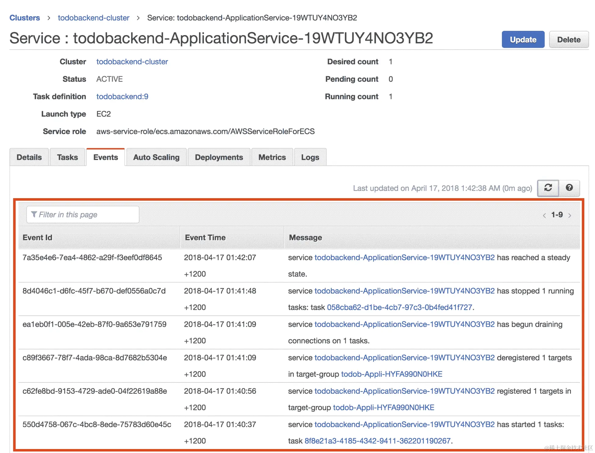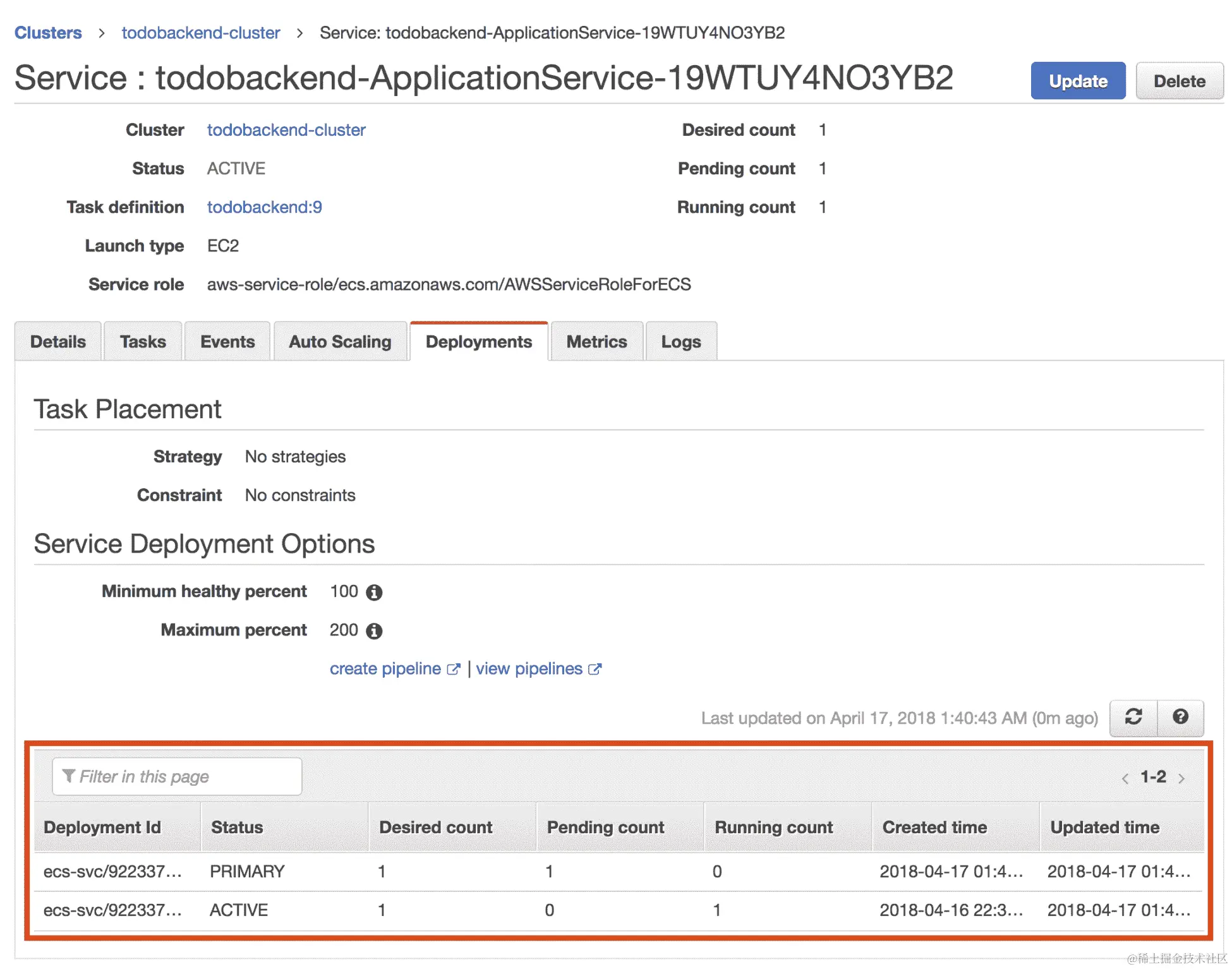 ApplicationService资源将根据与关联的ApplicationTaskDefinition的更改进行更新,并且类似于MigrateTask,每个应用程序实例现在在启动时将注入与todobackend/credentials密钥相关的环境变量。更新将触发ApplicationService的滚动部署,这将使新版本的应用程序投入使用,然后排空和移除旧版本的应用程序,而不会造成任何中断。