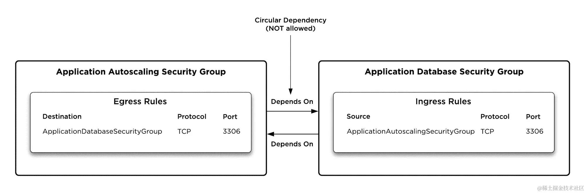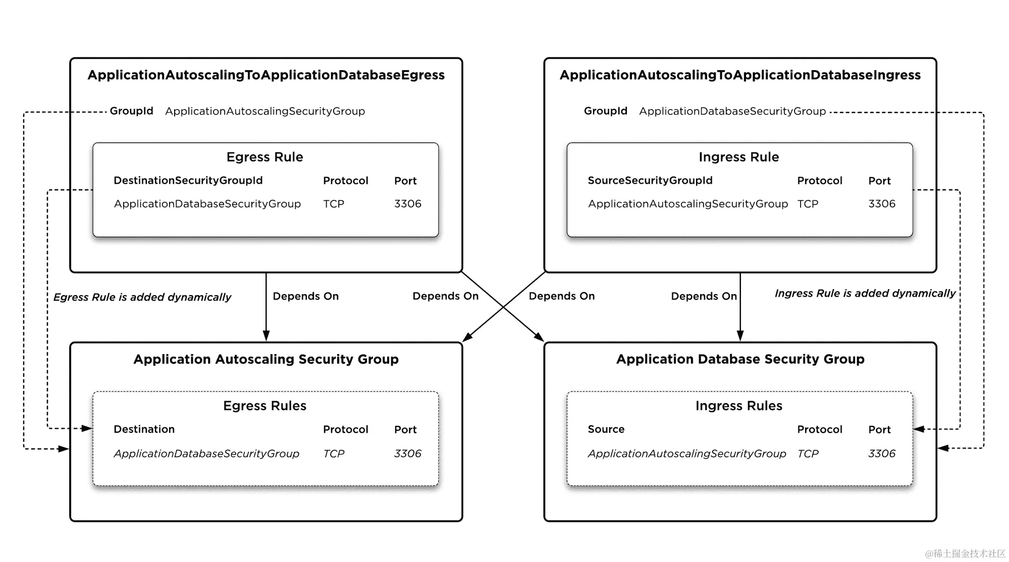 ApplicationDatabaseSecurityGroup:定义应用于 RDS 实例的入站和出站安全规则的安全组资源。 -