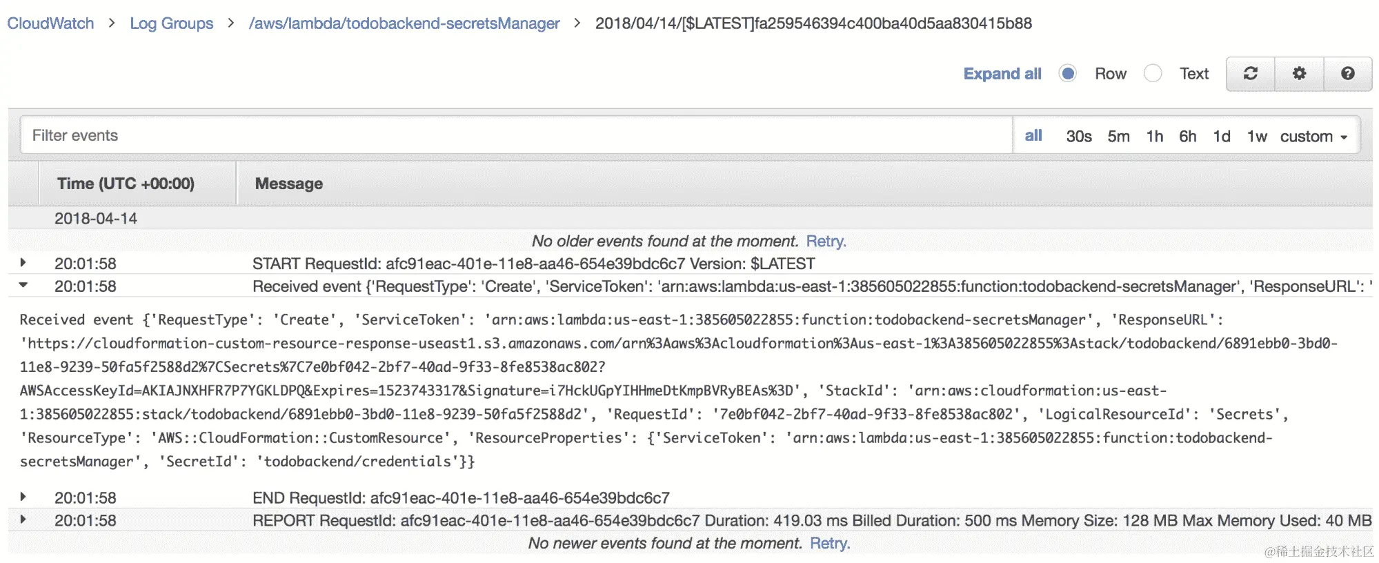 您还应该验证您的SecretsManagerFunction资源未记录秘密的明文值—以下屏幕截图显示了此功能的日志输出,并且您可以看到它抑制了发送回 CloudFormation 的成功响应的日志记录: