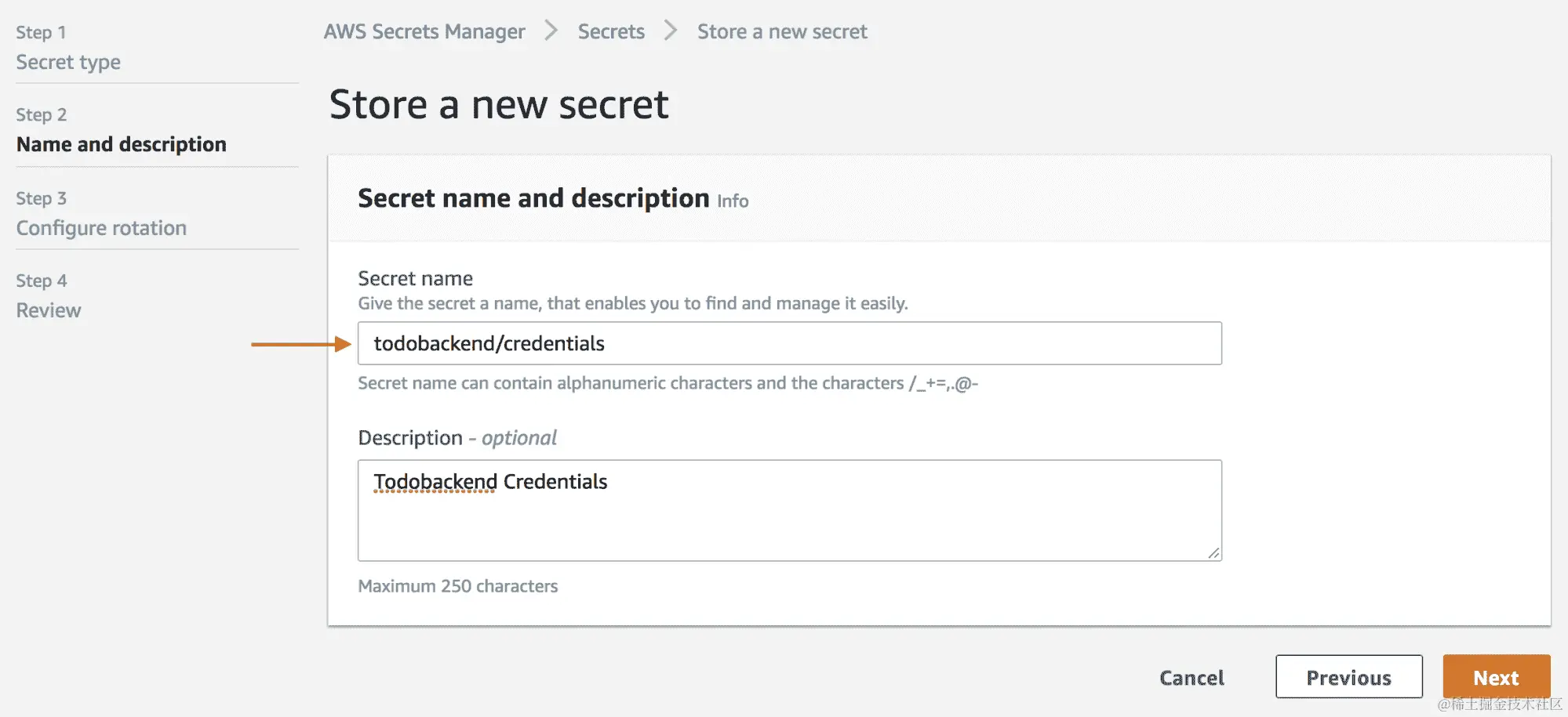 Secrets的自定义资源将被创建,一旦创建,将公开todobackend/credentials密钥的键/值对给其他 CloudFormation 资源。 -