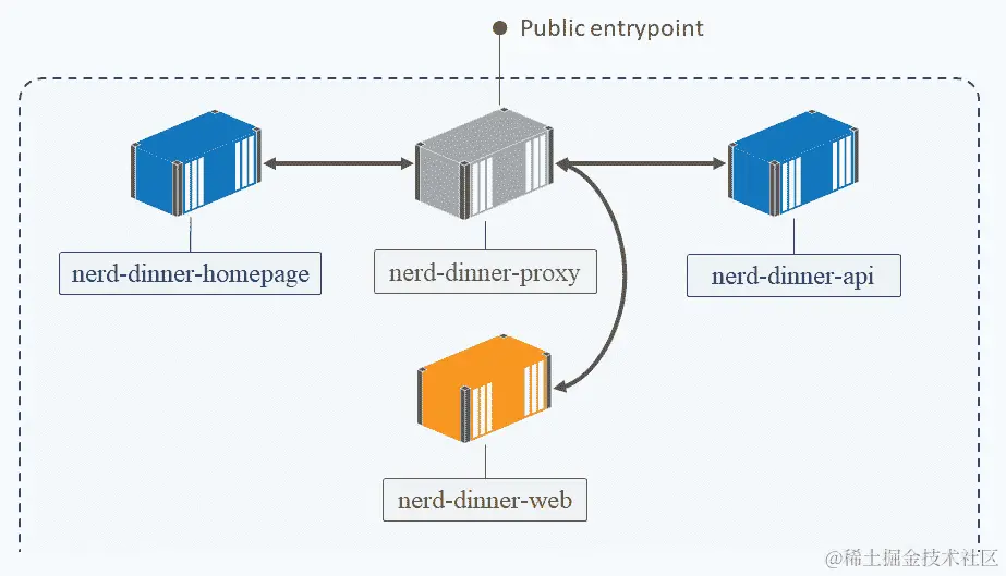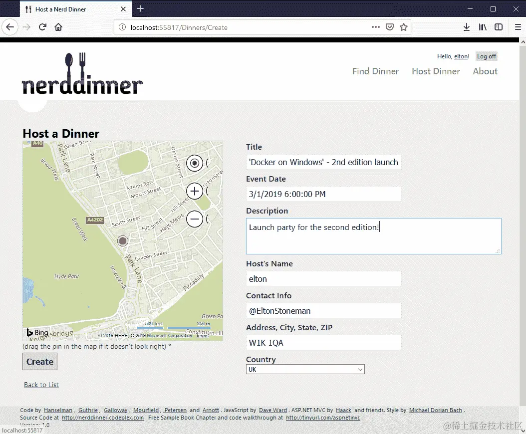 新的 NerdDinner 主页应用程序的 Dockerfile 具有健康检查,Docker 会等到新容器的健康检查通过后才会继续替换下一个容器。在滚动更新期间,一些用户将看到旧的主页,而一些用户将看到时尚的新主页: