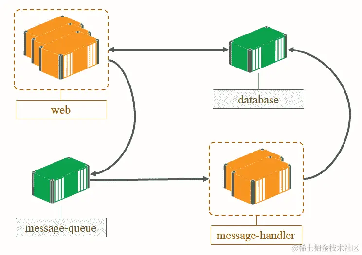 采用以容器为先的方法,可以以不同的方式来看待设计。如果您确定了一个功能,它会进行昂贵的数据库调用,但不需要同步运行,您可以将数据库代码移动到一个单独的组件中。然后,您可以在组件之间使用异步消息传递,从主 Web 应用程序发布事件到消息队列,并在新组件中对事件消息进行操作。使用 Docker,这些组件中的每一个都将在一个或多个容器中运行: