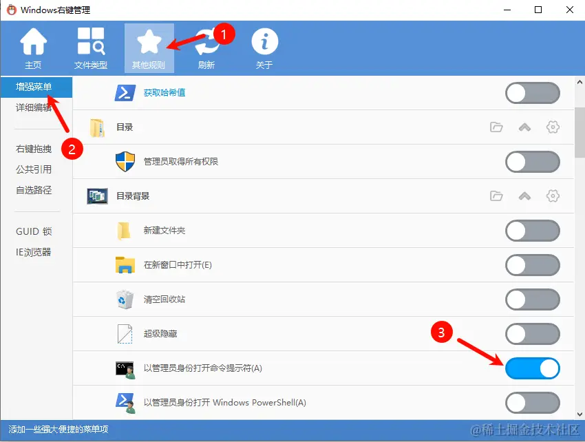 以 4.0 举例,双击运行软件:ContextMenuManager.NET.4.0.exe 之后,主界面 - 其他规则 - 增强菜单 - 打勾“以管理员身份打开命令提示符(A)”。