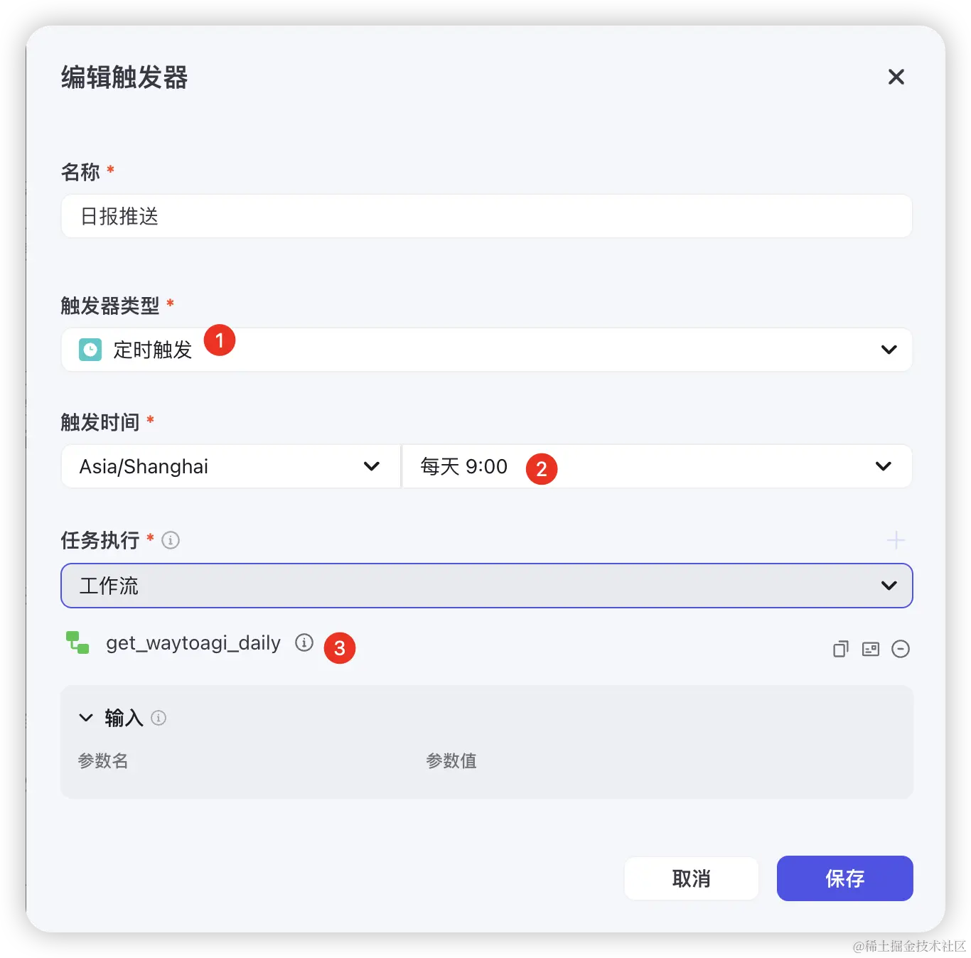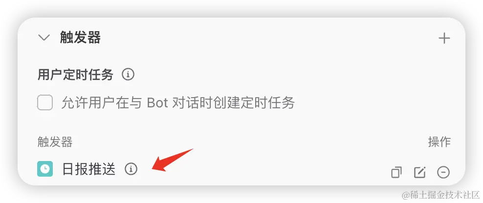 - 基础功能都实现了,最后我们来在 Bot 设计界面加一个触发器,用于定时触发工作流,并设置触发时间,比如每天早上 9 点会推送到飞书上: