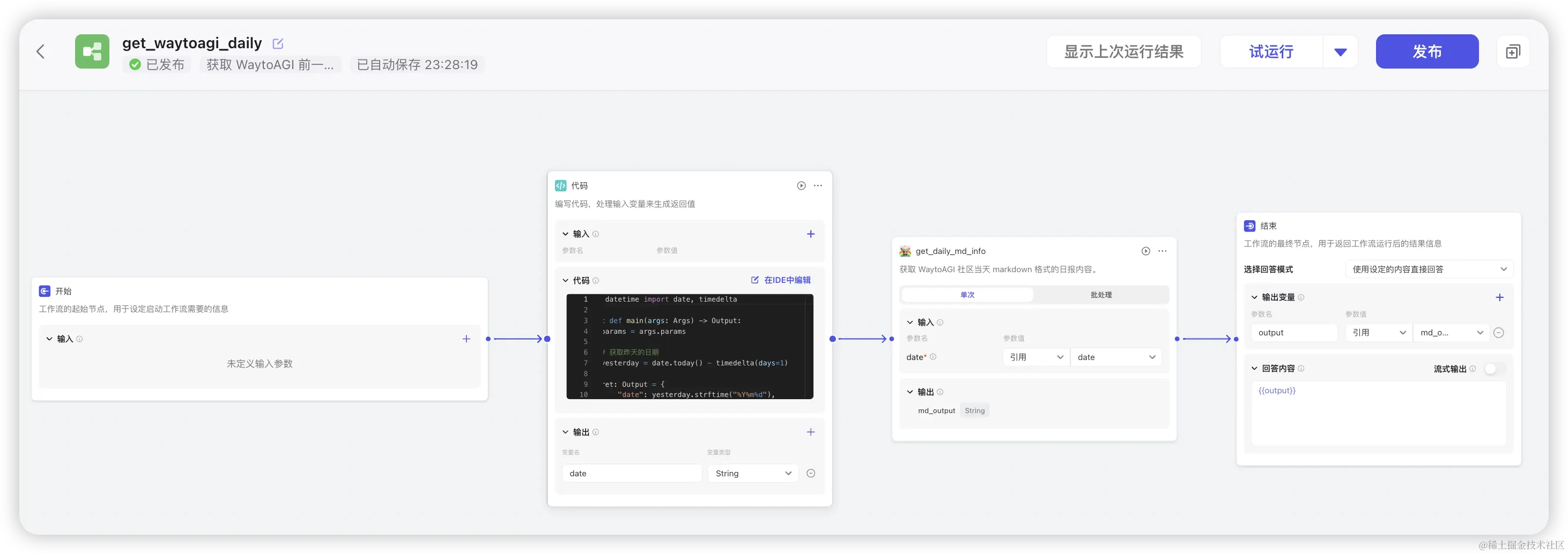 开始 -> 代码块获取当前时间前一天的日期(社区一般都是当天才发布前一天的日报) -> 调用上述的自定义插件抓取日报内容 -> 输出内容并结束。