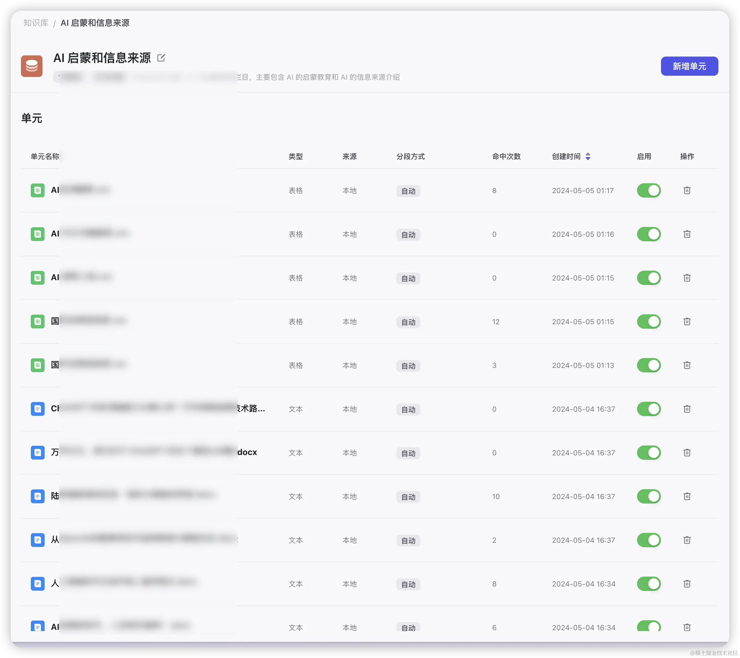 基于 RAG 机制,我们可以实现知识库问答功能。首先,我们需要创建一个知识库,里面包含了大量社区的 AI 相关的文章和资料。比如我这里创建了一个有关AI 启蒙和信息来源的知识库,然后通过手工录入的方式上传这个栏目的所有文章内容: