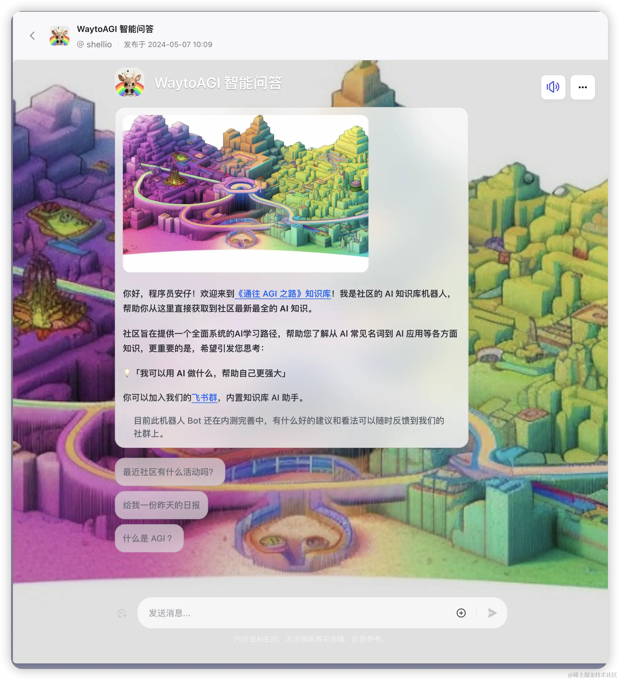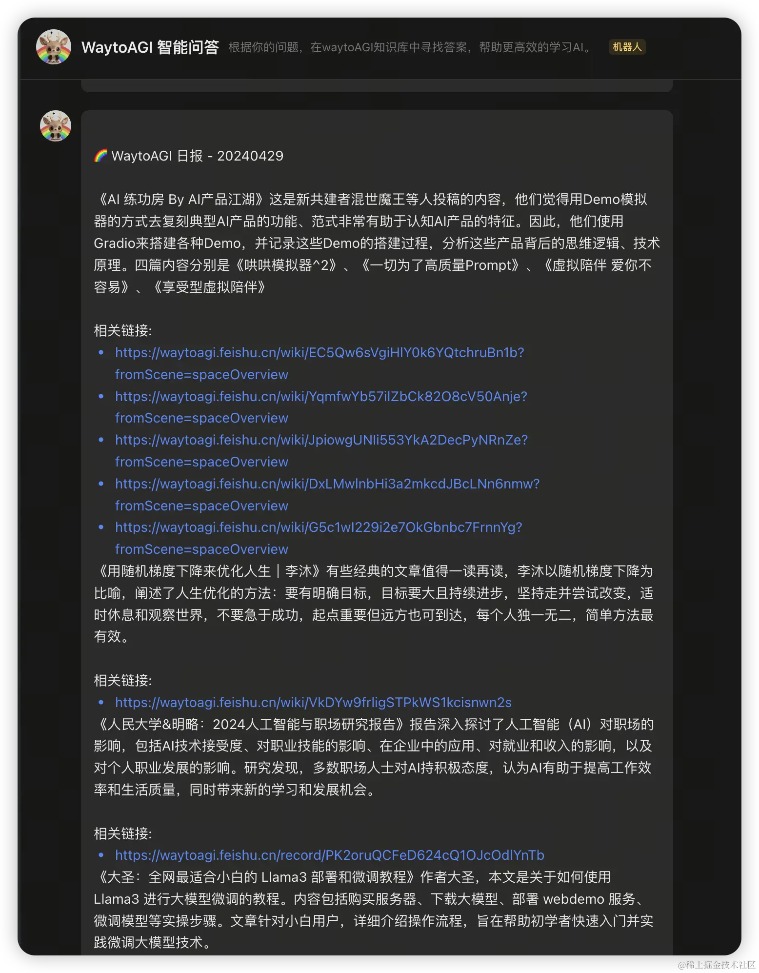 就拿我们社区来说,经常有新人问一些关于 AI 的基础问题,比如"AGI 是什么"、"什么是 ChatGPT"之类的。以前大家都是手动复制粘贴一些文档链接给他们,现在直接让机器人来回答,既提高了效率,又能保证答案的准确性和一致性。