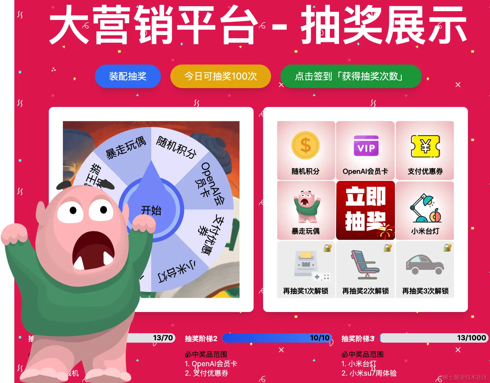 - 抽奖为免费抽奖次数 + 用户消耗个人积分抽奖