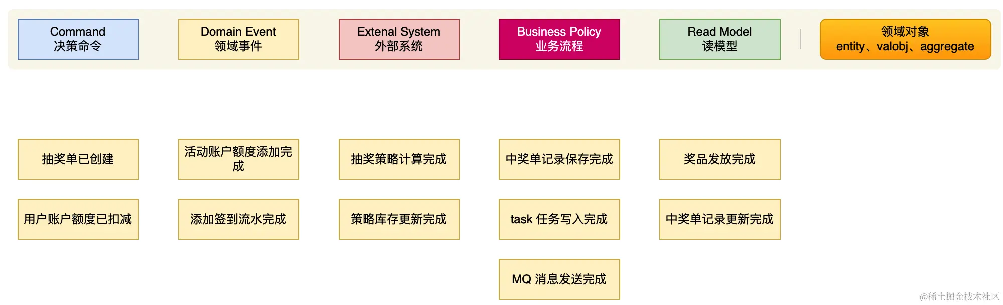 - 黄色 - 领域事件,过去时态描述。如;签到完成、抽奖完成、奖品发放完成。它所阐述的都是这个领域要完成的终态。