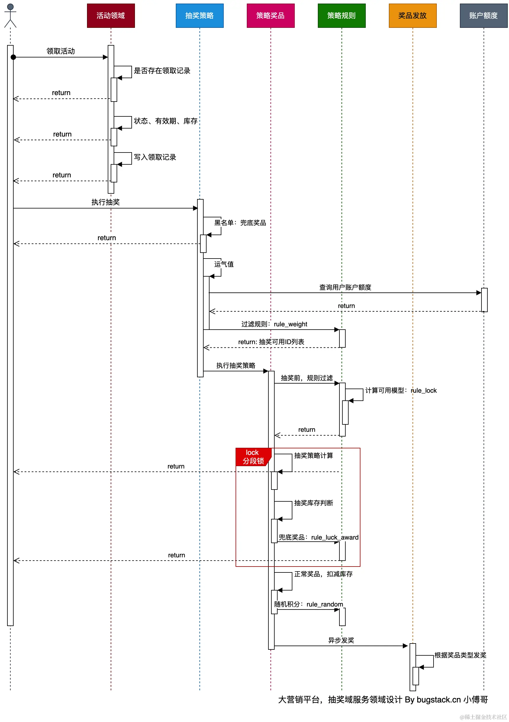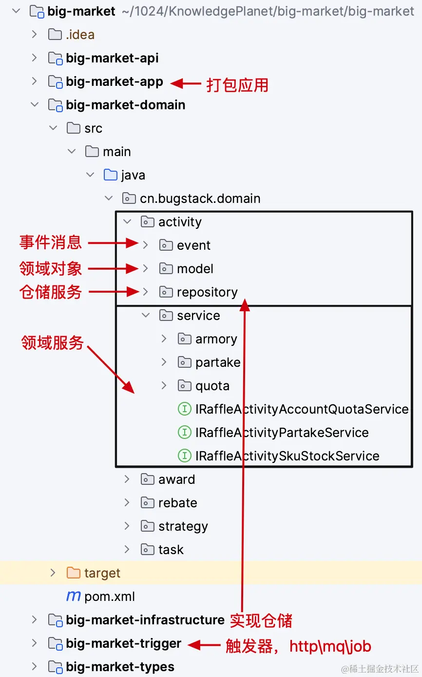 如图,是一个复杂的营销抽奖场景玩法需求,涵盖了;活动配置、签到&奖励、活动账户、抽奖策略「责任链+规则树」、库存扣减、抽奖满N次后阶梯抽奖等。面对这样的复杂系统,非常适合使用 DDD 落地。