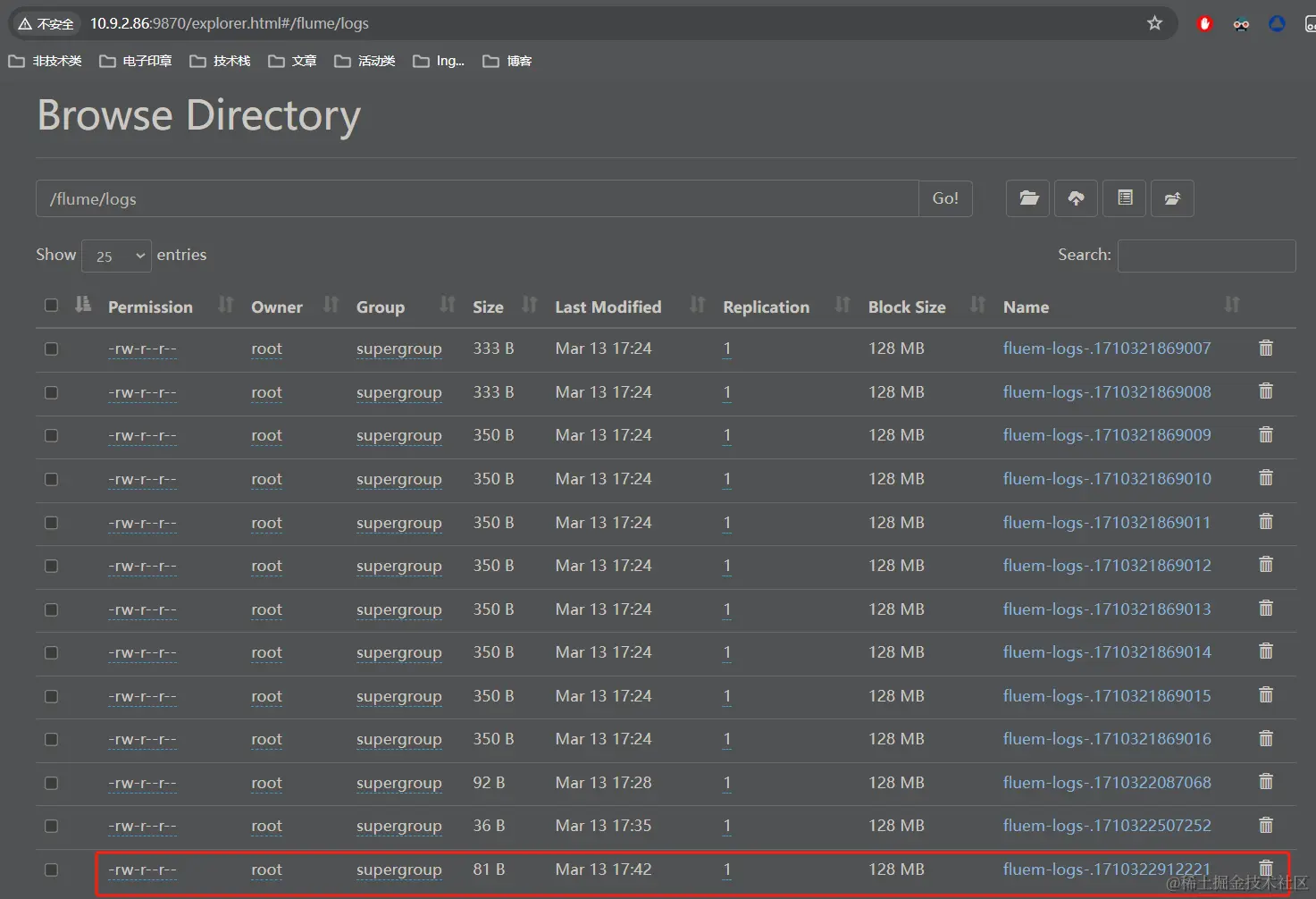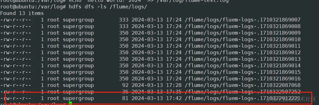 启动Flume Agent后,可以通过查看HDFS上的文件来验证数据是否成功上传。