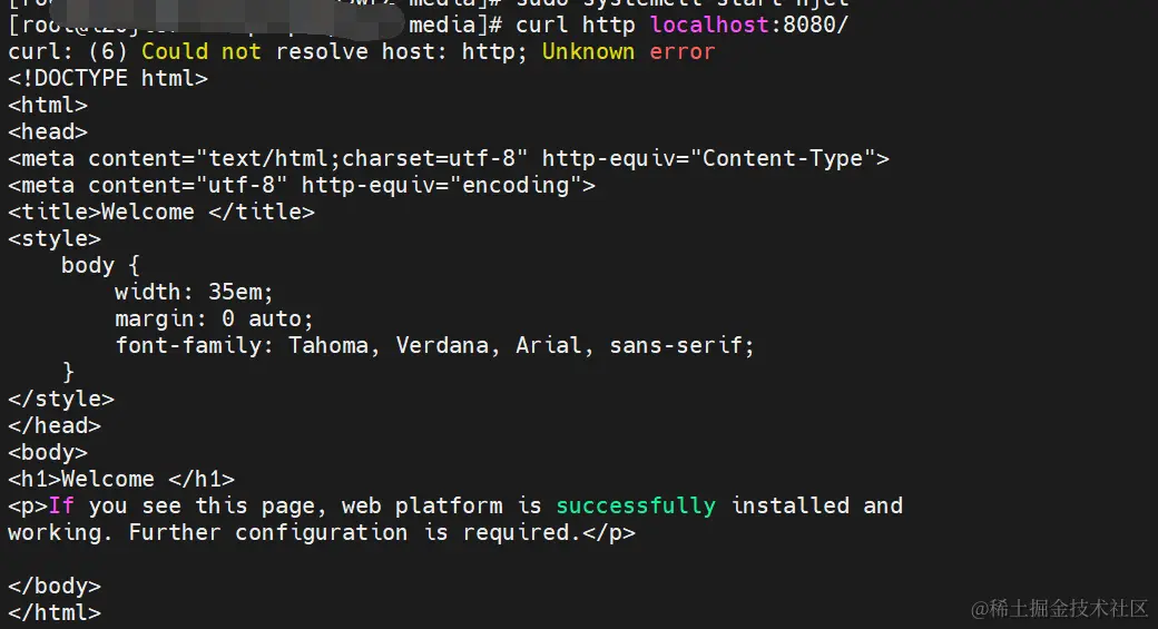 安装成功后,就可以使用 sudo systemctl start njet 启动服务,以 root 权限执行 systemctl 工具,然后可以通过浏览器或命令curl http localhost:8080/访问访问部署机器的8080地址,显示If you see this page, web platform is successfully installed andworking. Further configuration is required.或者输出以下html内容说明OpenNJet安装成功!