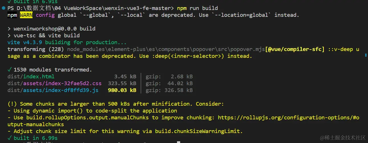首先,我们将开发好的应用程序进行打包,这里我打包了一个之前开发的Vue项目,直接在终端输入npm run build或者vite build进行打包就可以,不同项目的打包指令和流程可能不相同,需要查看package.json的具体配置。