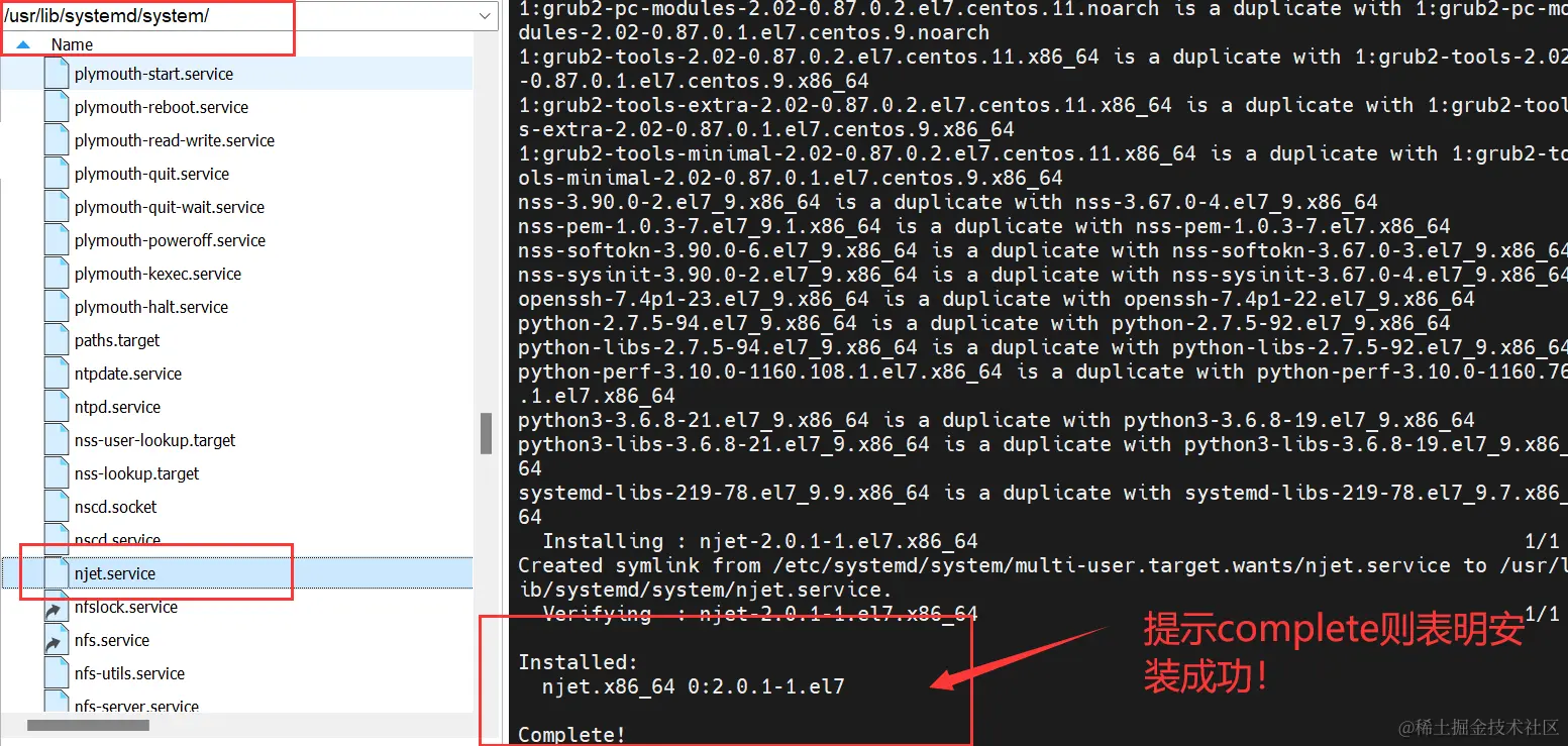 使用 rpm 或 deb 二进制安装后,会在 /usr/lib/systemd/system/ 目录下添加 service文件,并提示Complete!表明成功。