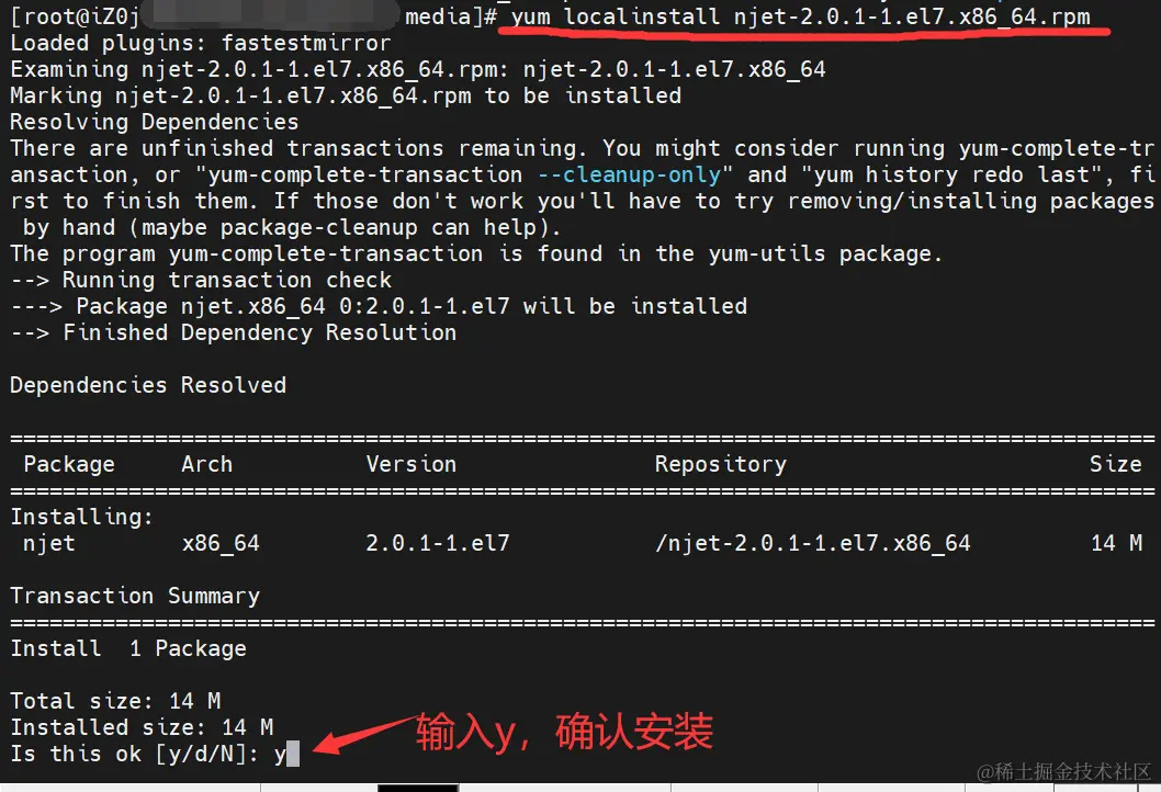 将对应的rpm包或者deb安装好后,使用yum或者dpkg方法安装,由于本机是CentOS系统,故在终端输入yum localinstall njet-2.0.1-1.el7.x86_64.rpm进行安装:
