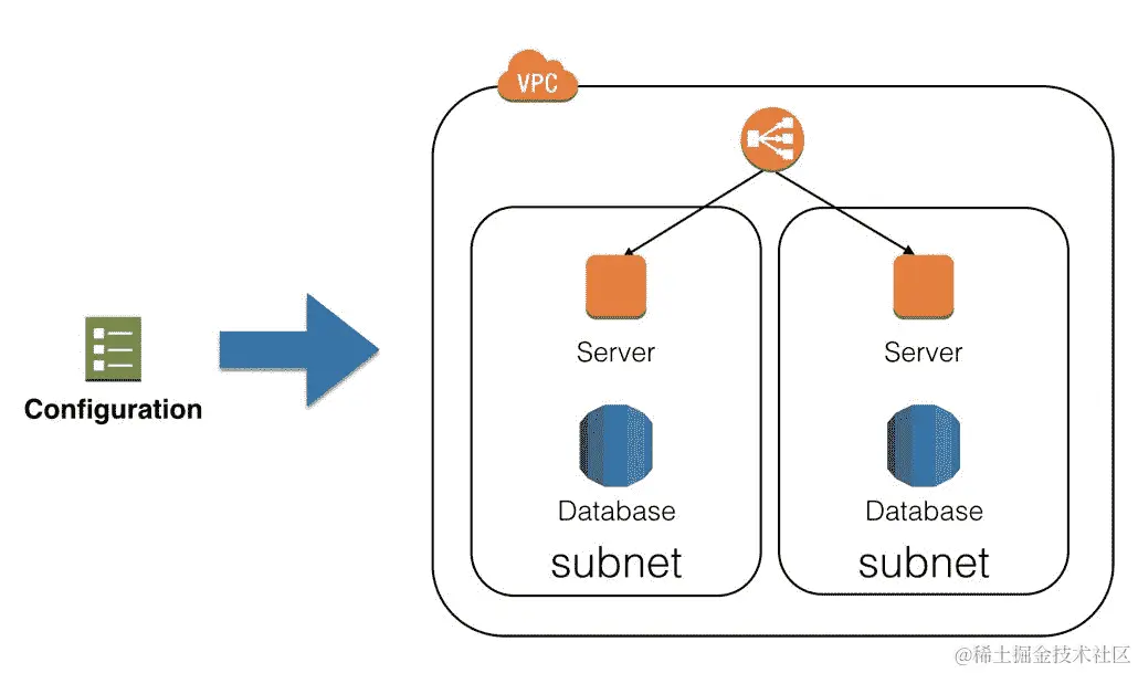 但是配置管理工具还可以通过配置文件自动设置云基础架构,如下图所示: