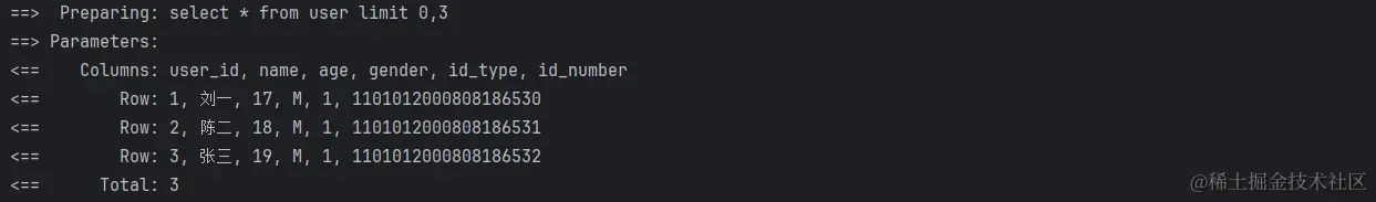 执行单元测试可以看到,虽然我们在 MyBatis 映射器中编写的 SQL 语句没有做任何限制,但实际上我们查询的结果只返回了 3 条数据,这就在 MyBatis 中实现逻辑(内存)分页的方式。