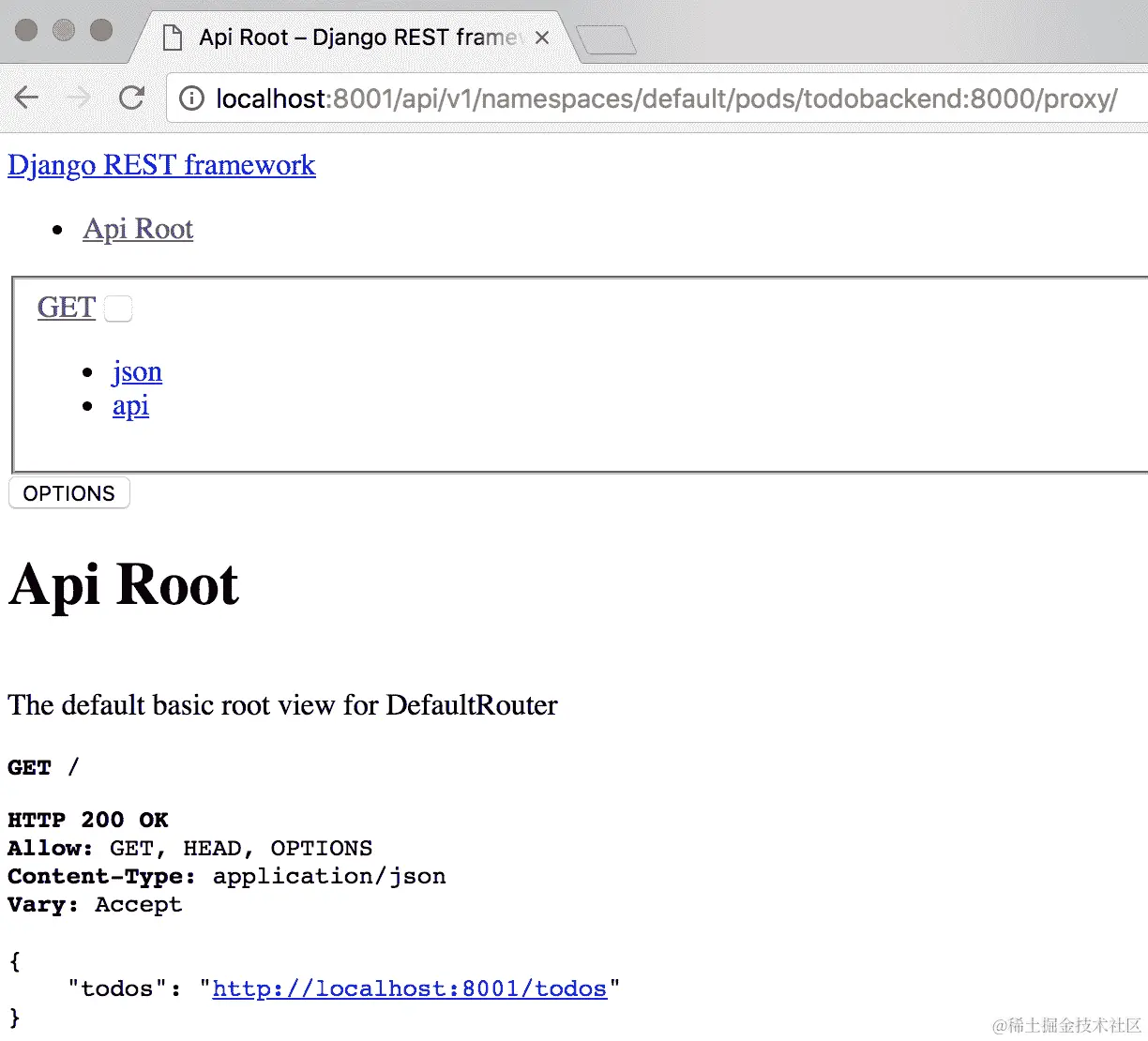在 Kubernetes 仪表板中查看 todobackend 服务您还可以通过运行 kubectl describe svc/todobackend 命令来获取外部端点 URL。