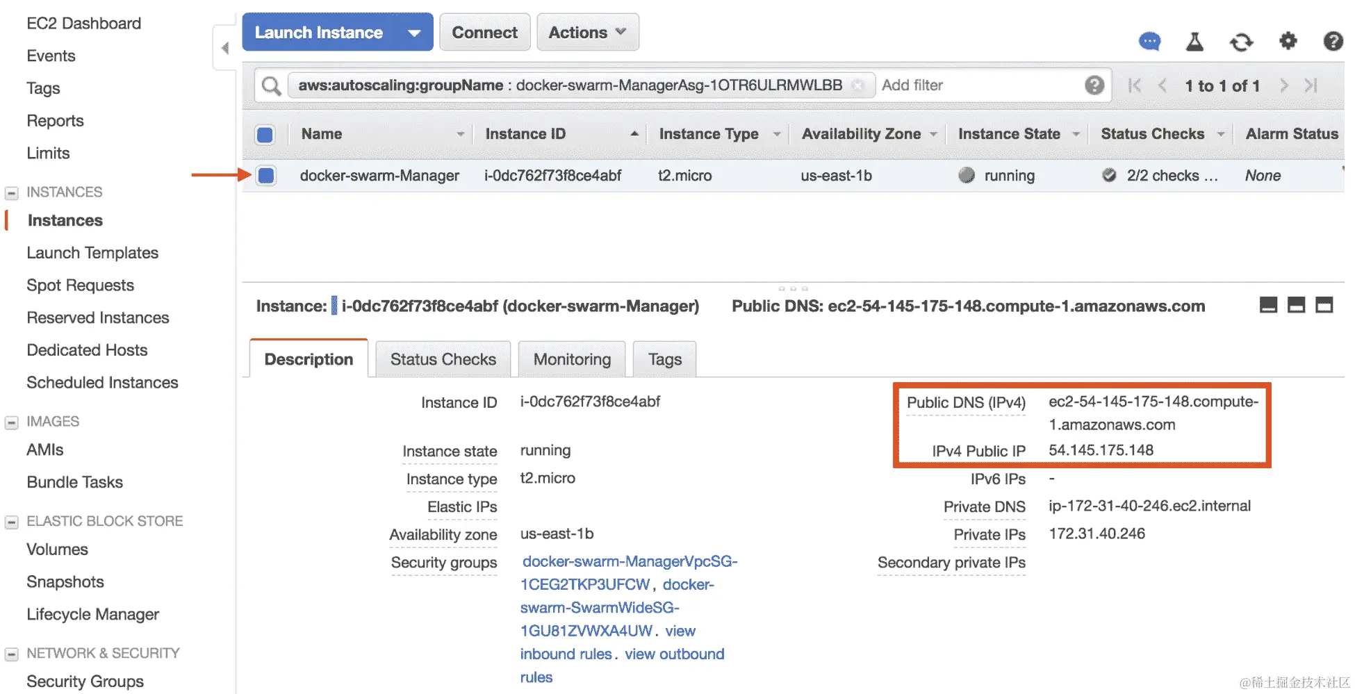 您可以使用这些信息来获取您的 Swarm 管理器之一的公共 IP 地址或 DNS 名称。一旦您有了这个 IP 地址,您就可以建立到管理器的 SSH 连接。