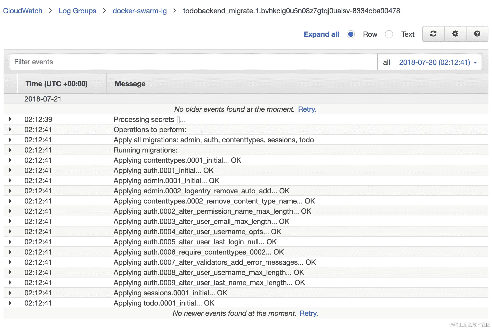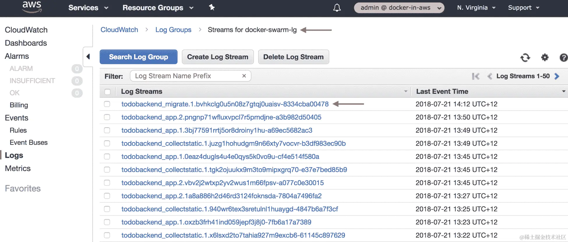 CloudWatch 日志组: 这存储了通过您的 Swarm 集群安排的所有容器日志。只有在堆栈创建期间启用了使用 Cloudwatch 进行容器日志记录参数时(默认情况下,此参数已启用),才会创建此资源。