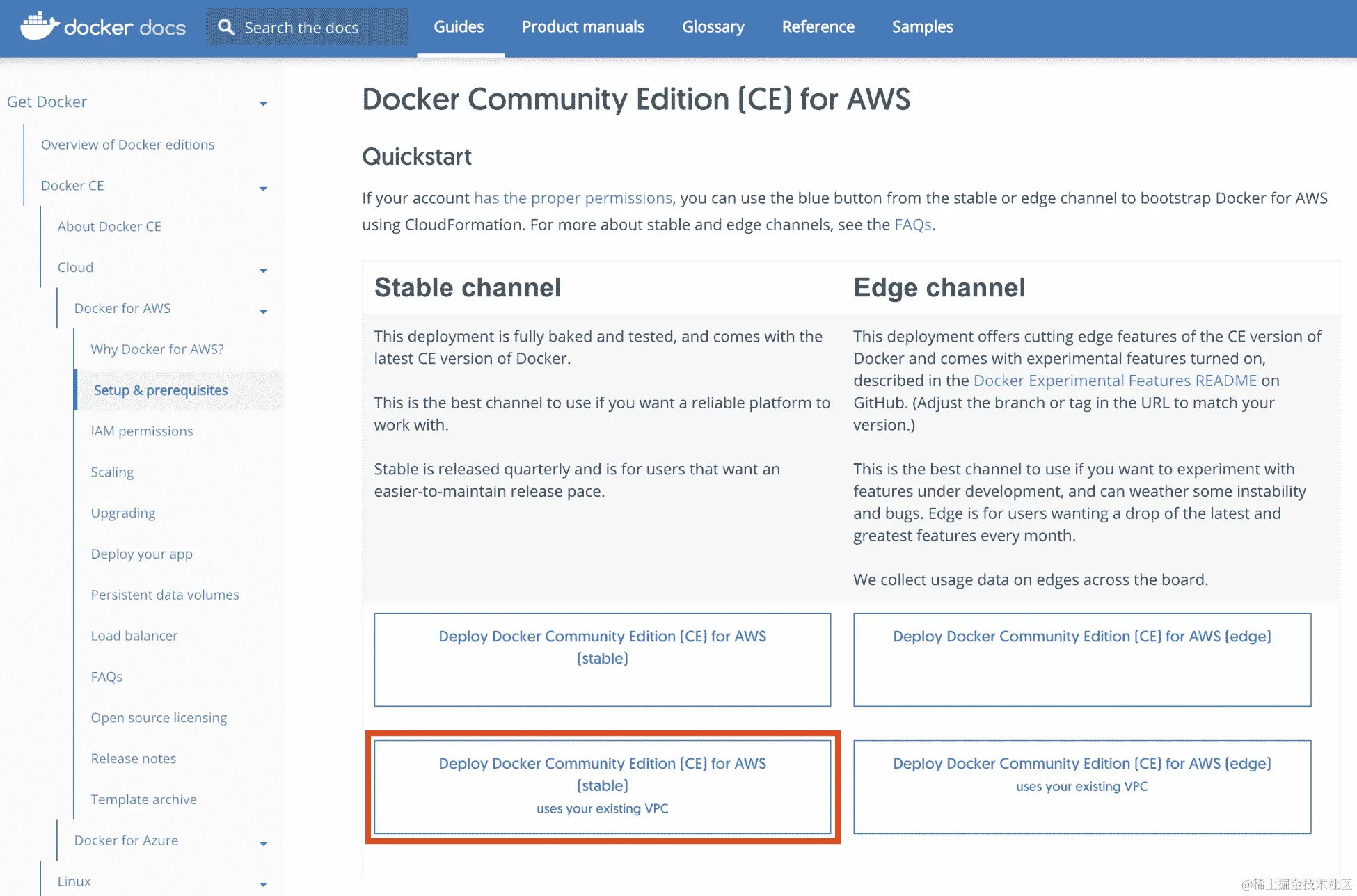 在 AWS 中快速启动 Docker Swarm 的推荐方法是使用 Docker for AWS,你可以在docs.docker.com/docker-for-aws/上了解更多。如果你浏览到这个页面,在设置和先决条件部分,你将看到允许你安装 Docker 企业版(EE)和 Docker 社区版(CE)for AWS 的链接。