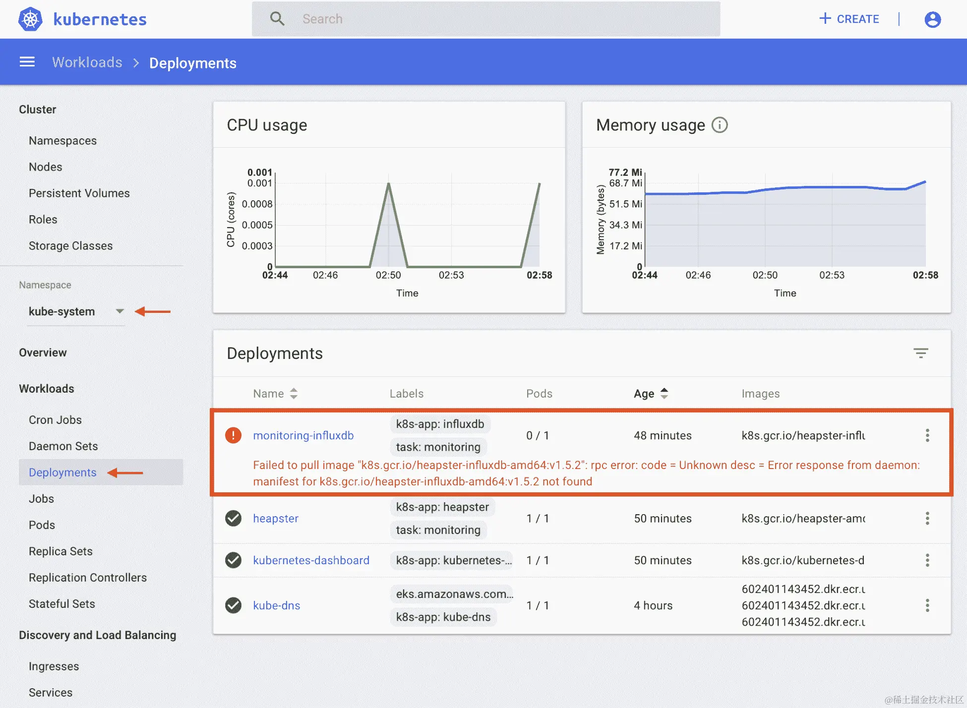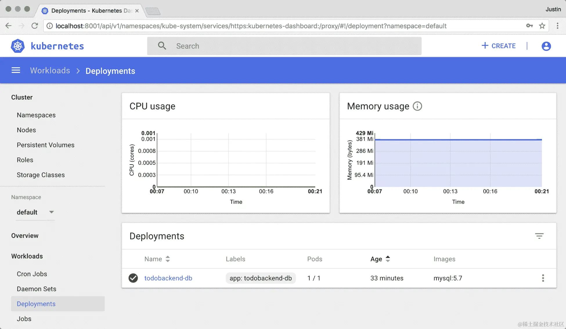在 Kubernetes 仪表板中,您可以通过选择工作负载 | 部署来验证todobackend-db部署是否正在运行: