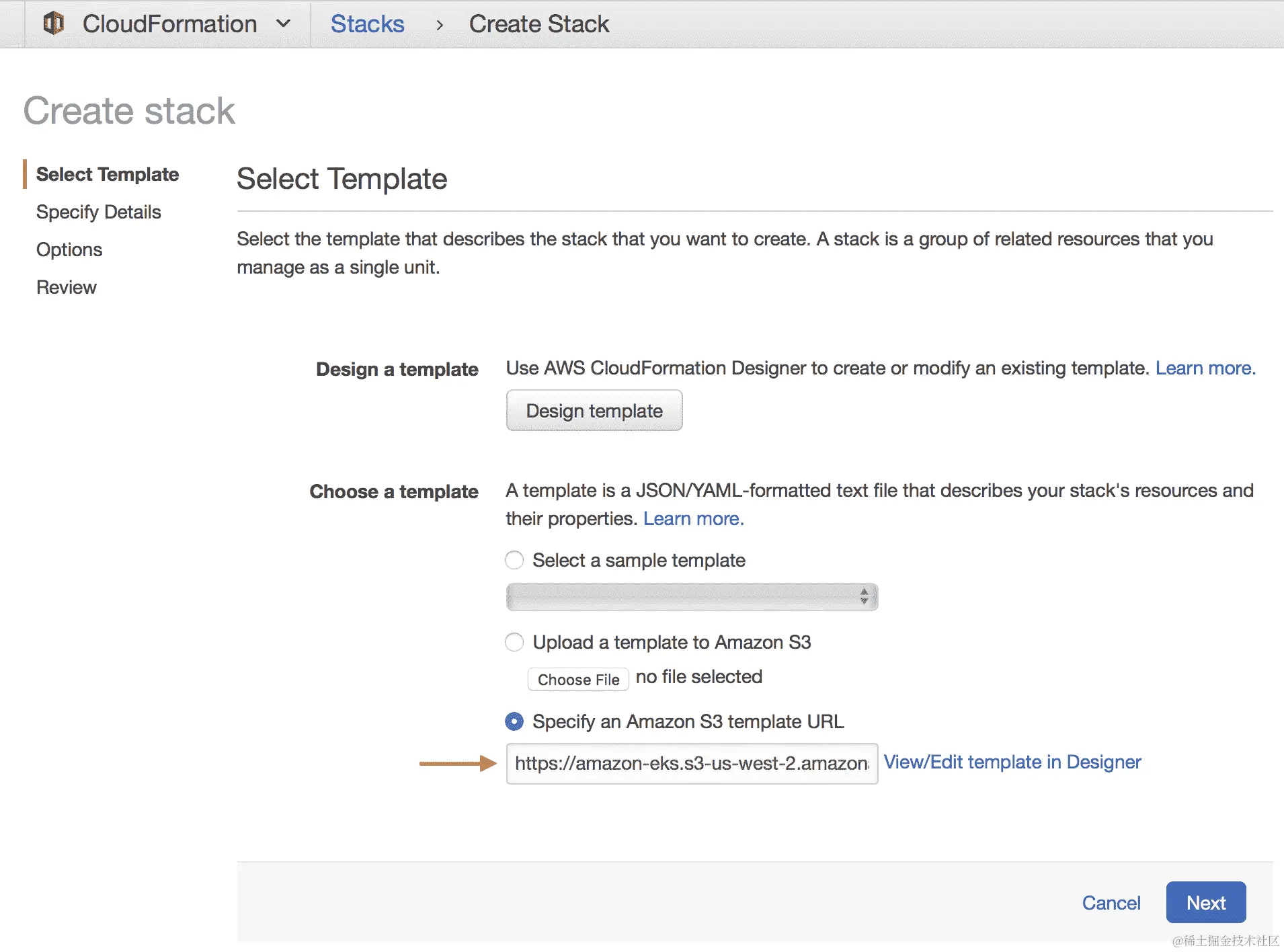 鉴于我们已经有一个现有的 VPC,如果你点击部署 Docker CE for AWS(稳定版)用户现有的 VPC 选项,你将被重定向到 AWS CloudFormation 控制台,在那里你将被提示使用 Docker 发布的模板创建一个新的堆栈: