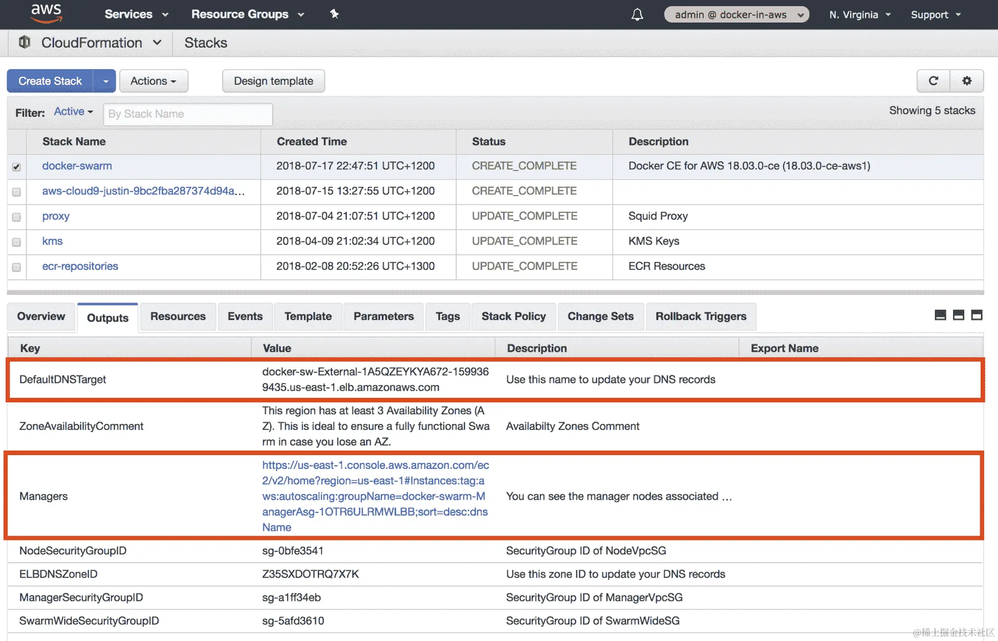 此时,您的新 CloudFormation 堆栈将被创建,并且应在 10-15 分钟内完成。请注意,如果您想要增加集群中的管理器和/或工作节点数量,建议的方法是执行 CloudFormation 堆栈更新,修改定义管理器和工作节点计数的适当输入参数。另外,要升级 Docker for AWS Swarm Cluster,您应该应用包含 Docker Swarm 和其他各种资源更新的最新 CloudFormation 模板。