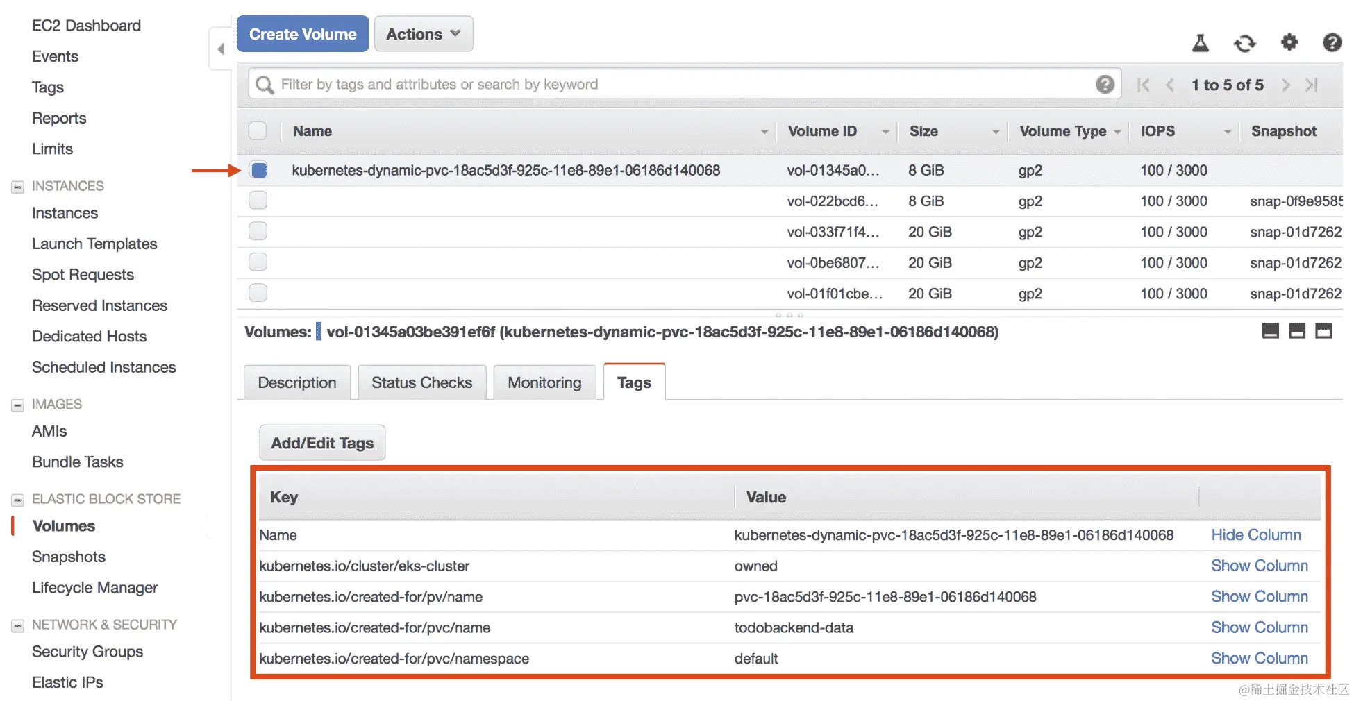 您可以看到已创建了持久卷,如果您在 AWS 控制台中浏览服务 | EC2并从左侧 ELASTIC BLOCK STORAGE 菜单中选择卷,您应该能够看到持久值的相应 EBS 卷: