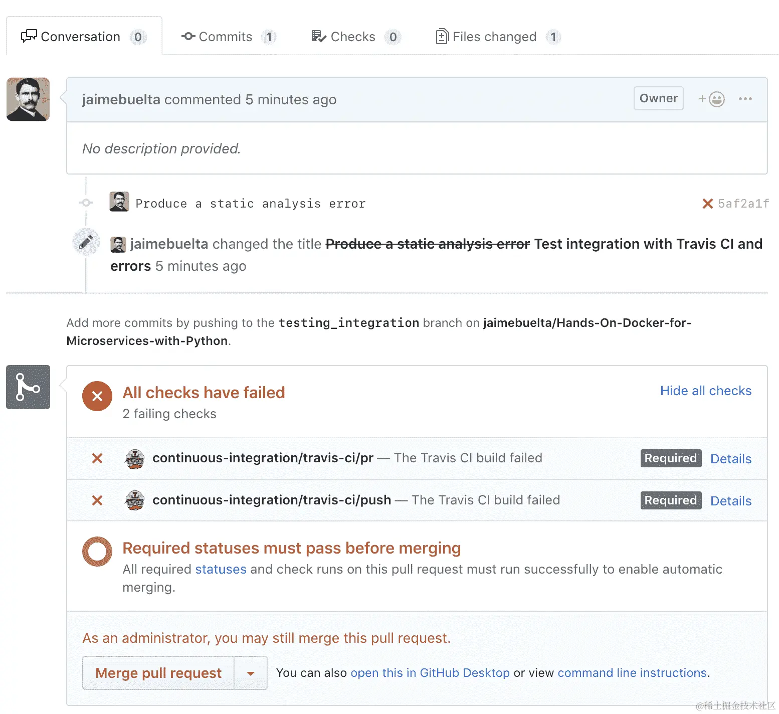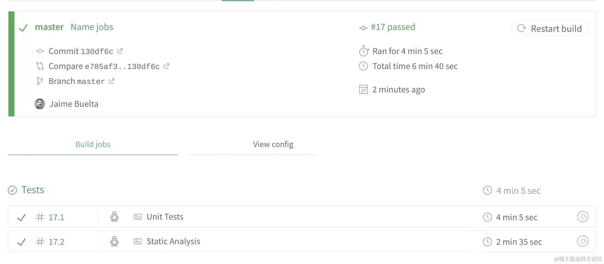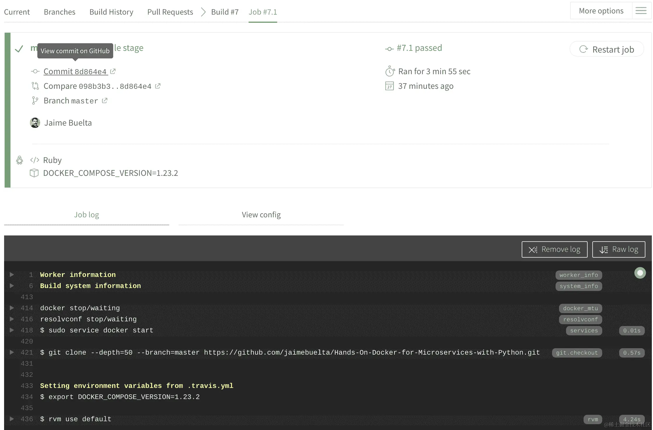 配置远程系统,如 Travis CI,有时可能会有点令人沮丧,因为它要求您推送一个提交以进行构建,以查看配置是否正确。此外,它使用一个 YAML 文件进行配置,在语法方面可能有点暴躁。您可能需要尝试几次才能得到稳定的东西,但不要担心。一旦设置好,您只能通过特定的拉取请求来更改它,因为配置文件也受源代码控制。